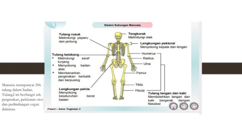 Manusia mempunyai 206 tulang dalam badan. Tulang2 ini berfungsi utk pergerakan, pelekatan otot dan perlindungan organ dalaman.
