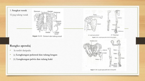 3. Sangkar rusuk 12 psg tulang rusuk Rangka apendaj • Ia terdiri daripada: • (a) Lengkungan pektoral dan tulang lengan • (b) Lengkungan pelvis dan tulang kaki