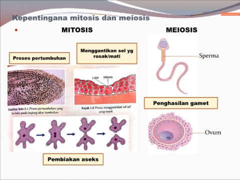 Kepentingana mitosis dan meiosis MITOSIS MEIOSIS Menggantikan sel yg Proses pertumbuhan rosak/mati Sperma Penghasilan gamet Ovum Pembiakan aseks