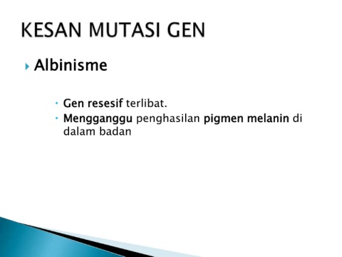 Albinisme Gen resesif terlibat. Mengganggu penghasilan pigmen melanin di dalam badan