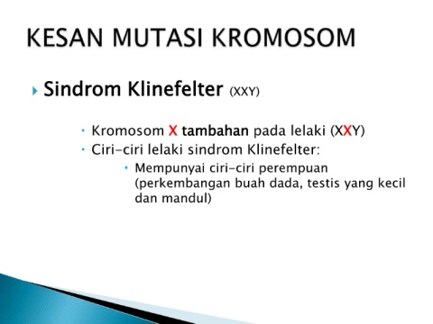 Sindrom Klinefelter (XXY) Kromosom X tambahan pada lelaki (XXY) Ciri-ciri lelaki sindrom Klinefelter: Mempunyai ciri-ciri perempuan (perkembangan buah dada, testis yang kecil dan mandul)