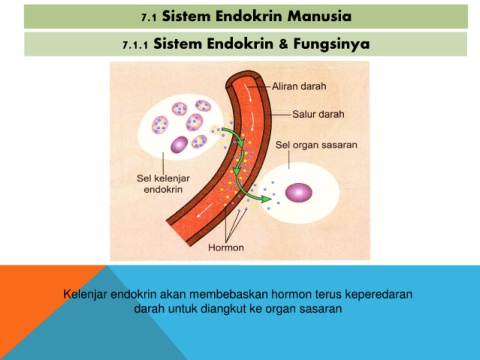 7.1 Sistem Endokrin Manusia 7.1.1 Sistem Endokrin & Fungsinya Kelenjar endokrin akan membebaskan hormon terus keperedaran darah untuk diangkut ke organ sasaran