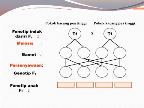 Pokok kacang pea tinggi Pokok kacang pea tinggi Fenotip induk Tt X Tt dariri F 1 : Meiosis : Gamet : Persenyawaan: Genotip F₂ Fenotip anak F₂ :