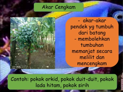 Akar Cengkam - akar-akar pendek yg tumbuh dari batang - membolehkan tumbuhan memanjat secara melilit dan mencengkam Contoh: pokok orkid, pokok duit-duit, pokok lada hitam, pokok sirih