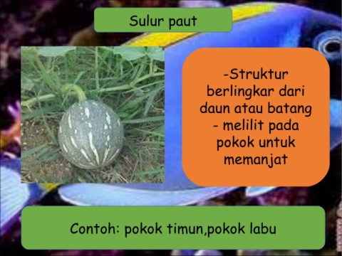 Sulur paut -Struktur berlingkar dari daun atau batang - melilit pada pokok untuk memanjat Contoh: pokok timun,pokok labu
