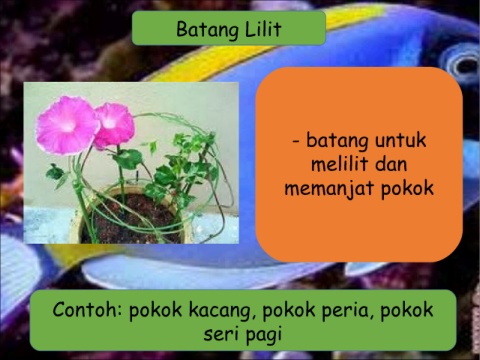 Batang Lilit - batang untuk melilit dan memanjat pokok Contoh: pokok kacang, pokok peria, pokok seri pagi