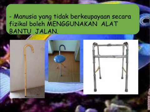 - Manusia yang tidak berkeupayaan secara fizikal boleh MENGGUNAKAN ALAT BANTU JALAN.