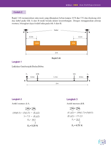 Rajah 3.46 menunjukkan satu rasuk yang dikenakan beban tumpu 10 N dan 5 N dan disokong oleh