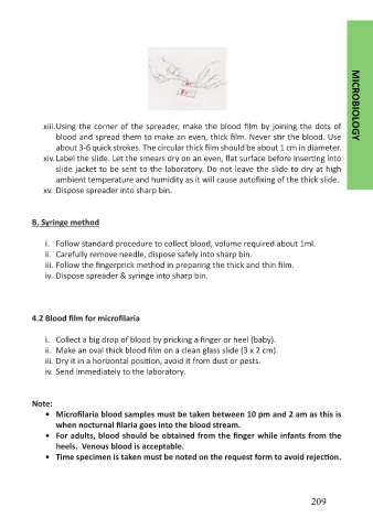 xiii. Using the corner of the spreader, make the blood film by joining the dots of MICROBIOLOGY