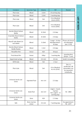 No. Test Unit Form Container Specimen Type Volume TAT Remark