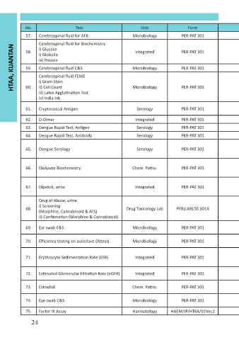 63. Dengue Rapid Test, Antigen Serology PER-PAT 301 Plain tube Blood 3.5ml 1-4 hours To consult Clinical