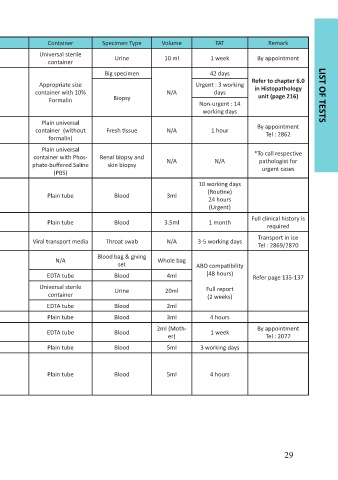No. Test Unit Form Container Specimen Type Volume TAT Remark