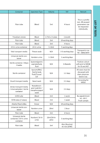 No. Test Unit Form Container Specimen Type Volume TAT Remark