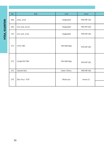 HTAA, KUANTAN 169. Uric acid, serum Integrated PER-PAT 301 Universal sterile con- Random / 24-hr 10ml/24-hr 5 working days