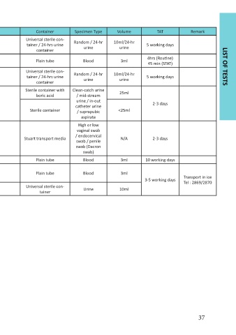 No. Test Unit Form Container Specimen Type Volume TAT Remark