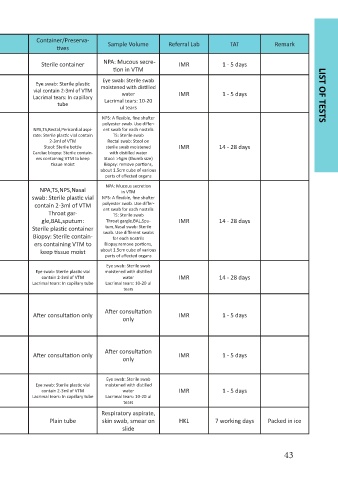 No. Test Unit Type of Specimen Form Sample Volume Referral Lab TAT Remark