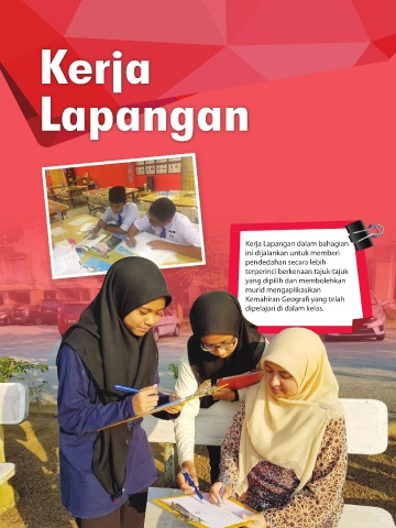 Kerja Lapangan Kerja Lapangan dalam bahagian ini dijalankan untuk memberi pendedahan secara lebih terperinci berkenaan tajuk-tajuk yang dipilih dan membolehkan murid mengaplikasikan Kemahiran Geografi yang telah dipelajari di dalam kelas.