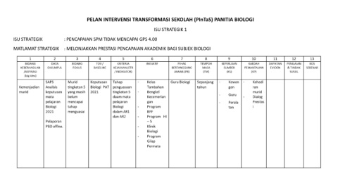 PELAN INTERVENSI TRANSFORMASI SEKOLAH (PInTaS) PANITIA BIOLOGI ISU STRATEGIK 1 ISU STRATEGIK : PENCAPAIAN SPM TIDAK MENCAPAI GPS 4.00 MATLAMAT STRATEGIK : MELONJAKKAN PRESTASI PENCAPAIAN AKADEMIK BAGI SUBJEK BIOLOGI
