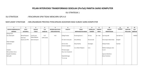 PELAN INTERVENSI TRANSFORMASI SEKOLAH (PInTaS) PANITIA SAINS KOMPUTER ISU STRATEGIK 1 ISU STRATEGIK : PENCAPAIAN SPM TIDAK MENCAPAI GPS 4.0 MATLAMAT STRATEGIK : MELONJAKKAN PRESTASI PENCAPAIAN AKADEMIK BAGI SUBJEK SAINS KOMPUTER