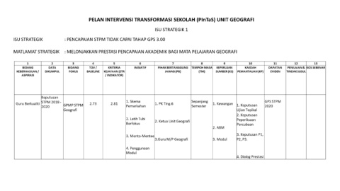 PELAN INTERVENSI TRANSFORMASI SEKOLAH (PInTaS) UNIT GEOGRAFI ISU STRATEGIK 1 ISU STRATEGIK : PENCAPAIAN STPM TIDAK CAPAI TAHAP GPS 3.00 MATLAMAT STRATEGIK : MELONJAKKAN PRESTASI PENCAPAIAN AKADEMIK BAGI MATA PELAJARAN GEOGRAFI