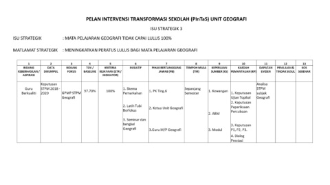 PELAN INTERVENSI TRANSFORMASI SEKOLAH (PInTaS) UNIT GEOGRAFI ISU STRATEGIK 3 ISU STRATEGIK : MATA PELAJARAN GEOGRAFI TIDAK CAPAI LULUS 100% MATLAMAT STRATEGIK : MENINGKATKAN PERATUS LULUS BAGI MATA PELAJARAN GEOGRAFI