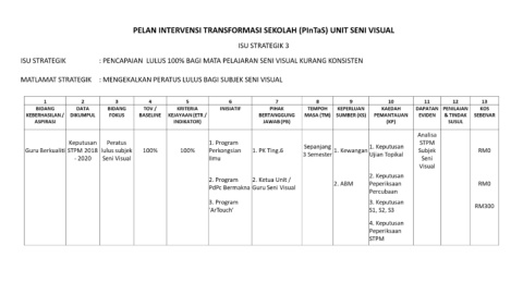 PELAN INTERVENSI TRANSFORMASI SEKOLAH (PInTaS) UNIT SENI VISUAL ISU STRATEGIK 3 ISU STRATEGIK : PENCAPAIAN LULUS 100% BAGI MATA PELAJARAN SENI VISUAL KURANG KONSISTEN MATLAMAT STRATEGIK : MENGEKALKAN PERATUS LULUS BAGI SUBJEK SENI VISUAL