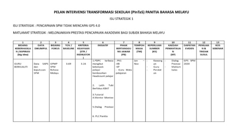 PELAN INTERVENSI TRANSFORMASI SEKOLAH (PInTaS) PANITIA BAHASA MELAYU ISU STRATEGIK 1 ISU STRATEGIK : PENCAPAIAN SPM TIDAK MENCAPAI GPS 4.0 MATLAMAT STRATEGIK : MELONJAKKAN PRESTASI PENCAPAIAN AKADEMIK BAGI SUBJEK BAHASA MELAYU