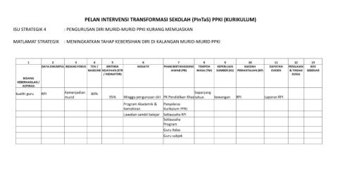 PELAN INTERVENSI TRANSFORMASI SEKOLAH (PInTaS) PPKI (KURIKULUM) ISU STRATEGIK 4 : PENGURUSAN DIRI MURID-MURID PPKI KURANG MEMUASKAN MATLAMAT STRATEGIK : MENINGKATKAN TAHAP KEBERSIHAN DIRI DI KALANGAN MURID-MURID PPKI