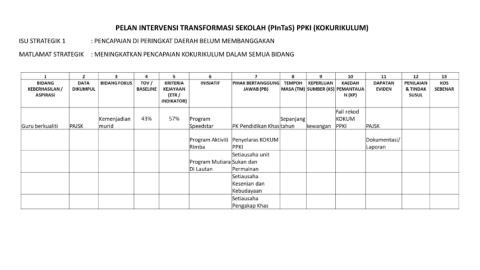 PELAN INTERVENSI TRANSFORMASI SEKOLAH (PInTaS) PPKI (KOKURIKULUM) ISU STRATEGIK 1 : PENCAPAIAN DI PERINGKAT DAERAH BELUM MEMBANGGAKAN MATLAMAT STRATEGIK : MENINGKATKAN PENCAPAIAN KOKURIKULUM DALAM SEMUA BIDANG