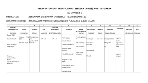 PELAN INTERVENSI TRANSFORMASI SEKOLAH (PInTaS) PANITIA SEJARAH ISU STRATEGIK 1 ISU STRATEGIK : PENCAPAIAN GRED PURATA SPM SEKOLAH TIDAK MENCAPAI 4.00 MATLAMAT STRATEGIK : MELONJAKKAN PRESTASI PENCAPAIAN GRED PURATA BAGI SUBJEK SEJARAH