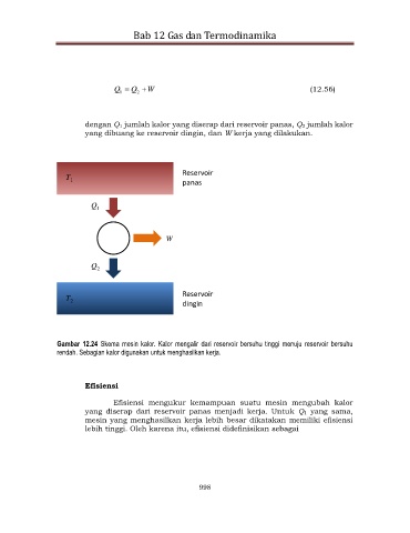 Gambar 12.24 Skema mesin kalor. Kalor mengalir dari reservoir bersuhu tinggi menuju reservoir bersuhu
