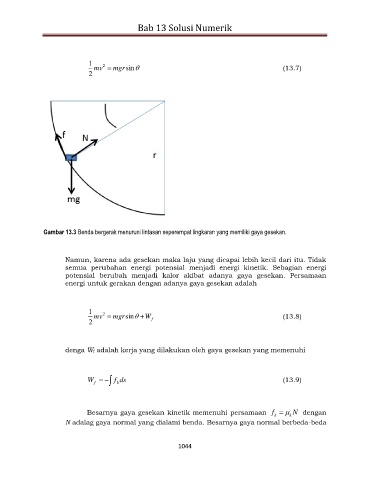 Gambar 13.3 Benda bergerak menuruni lintasan seperempat lingkaran yang memiliki gaya gesekan.