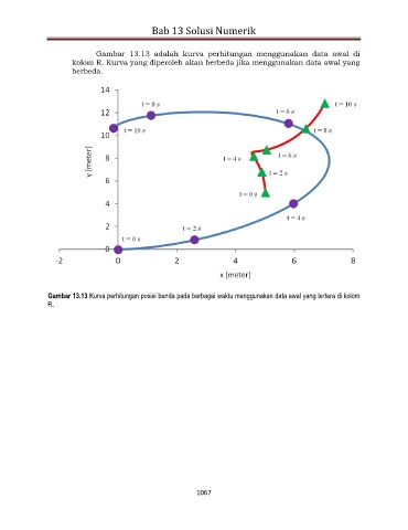 Gambar 13.13 Kurva perhitungan posisi benda pada berbagai waktu menggunakan data awal yang tertera di kolom