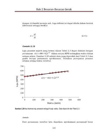 Gambar 2.20 Aproksimasi laju pesawat sebagai fungsi waktu. Data diperoleh dari Tabel 2.3.