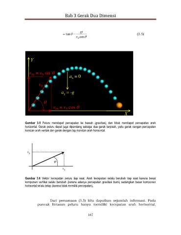 Gambar 3.6 Vektor kecepatan peluru tiap saat. Arah kecepatan selalu berubah tiap saat karena besar