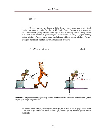 Gambar 4.12 (kiri) Benda dikenai gaya F yang arahnya membentuk sudut terhadap arah mendatar, (kanan)