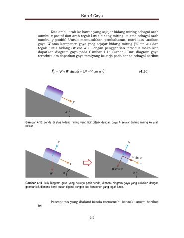 Gambar 4.13 Benda di atas bidang miring yang licin ditarik dengan gaya F sejajar bidang miring ke arah