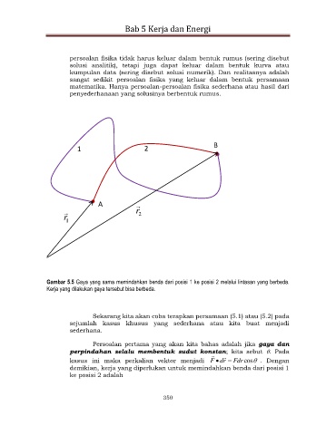 Gambar 5.5 Gaya yang sama memindahkan benda dari posisi 1 ke posisi 2 melalui lintasan yang berbeda.