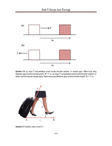 Gambar 5.6 (a) Gaya F menyebabkan posisi benda berubah sebesar x searah gaya. Maka kerja yang