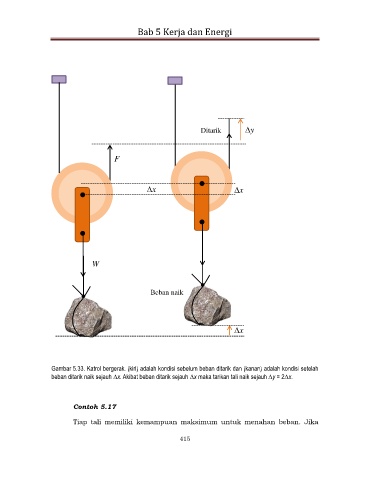 Gambar 5.33. Katrol bergerak. (kiri) adalah kondisi sebelum beban ditarik dan (kanan) adalah kondisi setelah