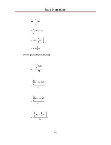 Bab 6 Momentum L M dx 0 L bxa 2 dx 0 1 3 L ax 3 bx 0 1 aL bL 2 3 Lokasi pusat massa batang L xdx x pm 0 M L a bx 2 xdx 0 M L ax bx 3 dx 0 M 1 2 1 4 L 2 ax 4 bx 0 M 475