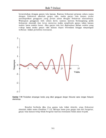 Gambar 7.10 Perubahan simpangan benda yang diberi gangguan dengan frekuensi sama dengan frekuensi
