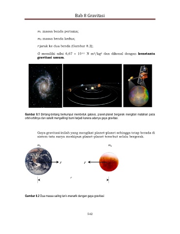 Gambar 8.2 Dua massa saling tarik-menarik dengan gaya gravitasi