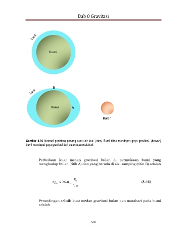 Gambar 8.16 Ilustrasi peristiwa pasang surut air laut. (atas) Bumi tidak mendapat gaya gravitasi, (bawah)