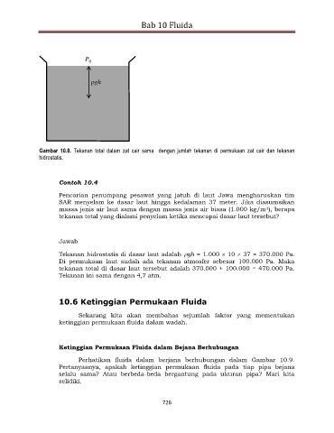 Gambar 10.8. Tekanan total dalam zat cair sama dengan jumlah tekanan di permukaan zat cair dan tekanan