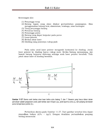 Gambar 11.57 Skema arah berkas sinar laser ketika suhu batang T0 dan T. Besaran yang harus diukur dalam