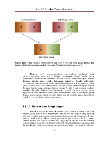 Gambar 12.10 Ilustrasi hokum ke-0 termodinamika. Jika benda A setimbang termal dengan benda B dan