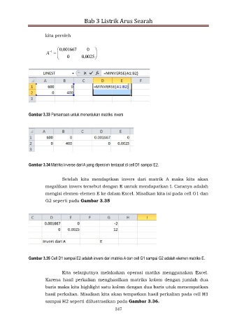 Gambar 3.35 Cell D1 sampai E2 adalah invers dari matriks A dan cell G1 sampai G2 adalah elemen matriks E.