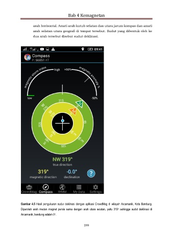 Diperoleh arah medan magnet persis sama dengan arah utara selatan, yaitu 319 sehingga sudut deklinasi di