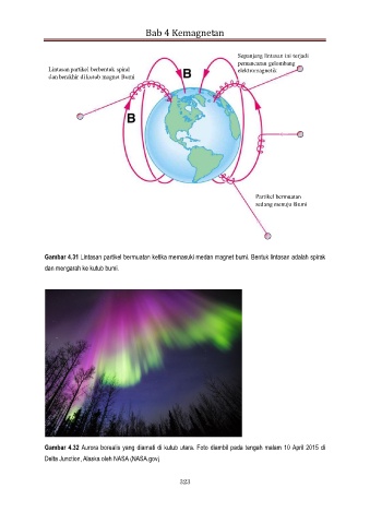 Gambar 4.31 Lintasan partikel bermuatan ketika memasuki medan magnet bumi. Bentuk lintasan adalah spirak
